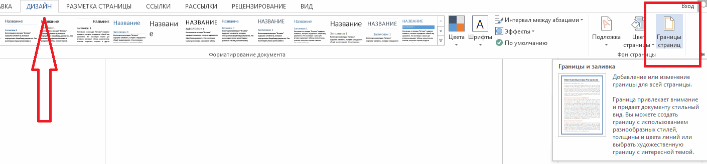 1) Заходим в меню «Дизайн» и выбираем инструмент «Границы страницы».
