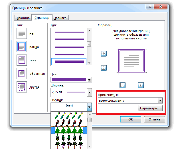 2) Появляется диалоговое окно «Границы и заливка». Выбираете вкладку «Страница», на ней отобразятся все необходимые вам инструменты. В колоне слева выбираете тип «Рамка». Теперь можно приступать к креативной деятельности.