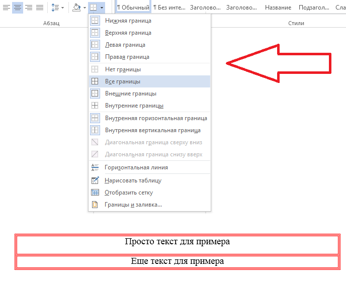 2) Выделите фрагмент текста, который хотите обрамить. Щелкните на иконку «Границы», чтобы открыть выпадающий список. Учтите, что редактор по умолчанию предложит вам именно ту рамку, которую вы создавали в этом сеансе с помощью «Границы и заливки». По крайней мере, в моей версии 2013-го года это происходит именно так.