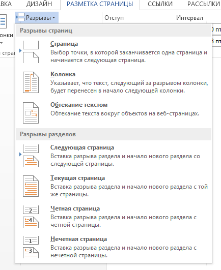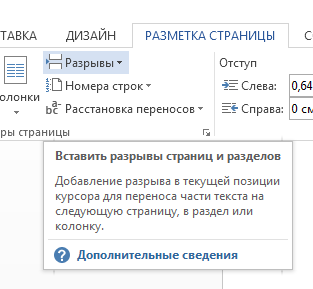 1) В панели «Разметка страницы» найдите меню «Разрывы». Щелкните по иконке, чтобы открыть выпадающий список.