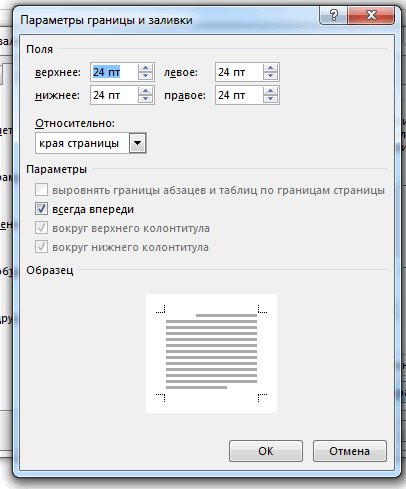 3) Всплывает новое диалоговое окно «Параметры границы и заливки». С помощью представленных здесь ячеек, вы можете менять размеры каждого элемента контура, приближать его к тексту или наоборот, отдалять.