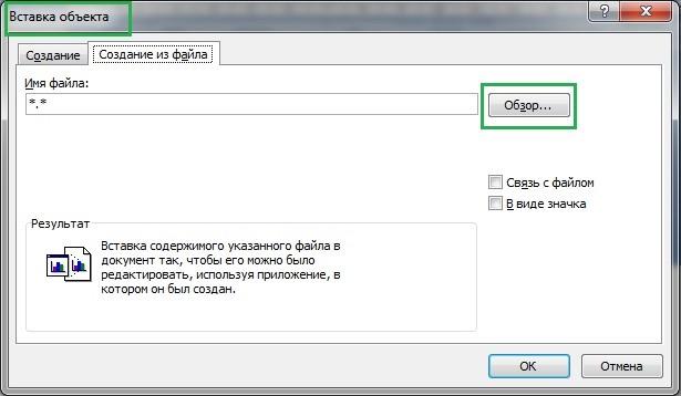 «Обзор» даст возможность выбрать нужный документ из всех сохраненных на вашем ПК. Выбрав нужный файл, в окне вставки появится директория этого документа.
