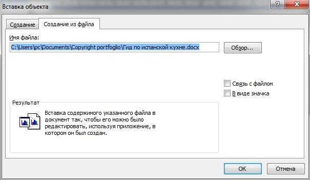 Чтобы вставить в новый документ один из старых, необходимо выбрать функцию «Объект» в меню «Вставка». Программа предложит выбрать формат документа, который вы хотите вставить. Среди всех форматов необходимо найти – Microsoft Word (далее будет указана версия программы, которой вы пользуетесь). В открывающемся окне «Вставка» необходимо выбрать подменю «Создать из файла» и нажать на «Обзор».